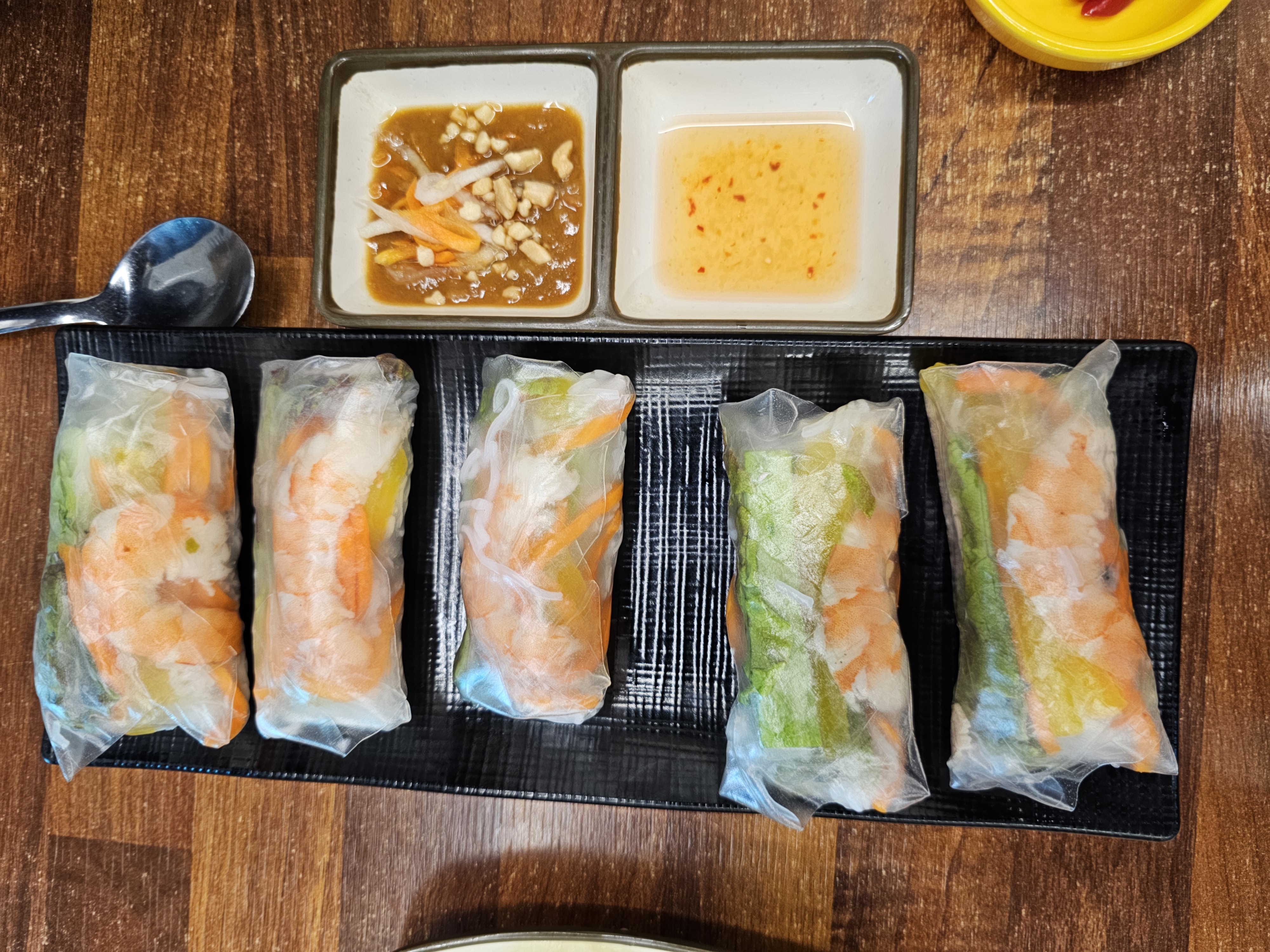 월남쌈은 솔직히 조금 실망했습니다. 보기에는 현지 느낌이 물씬 났는데, 안에 고수나 민트 같은 허브가 하나도 들어 있지 않아서인지 밋밋했거든요. 아마 기대치가 너무 높았던 것 같습니다.