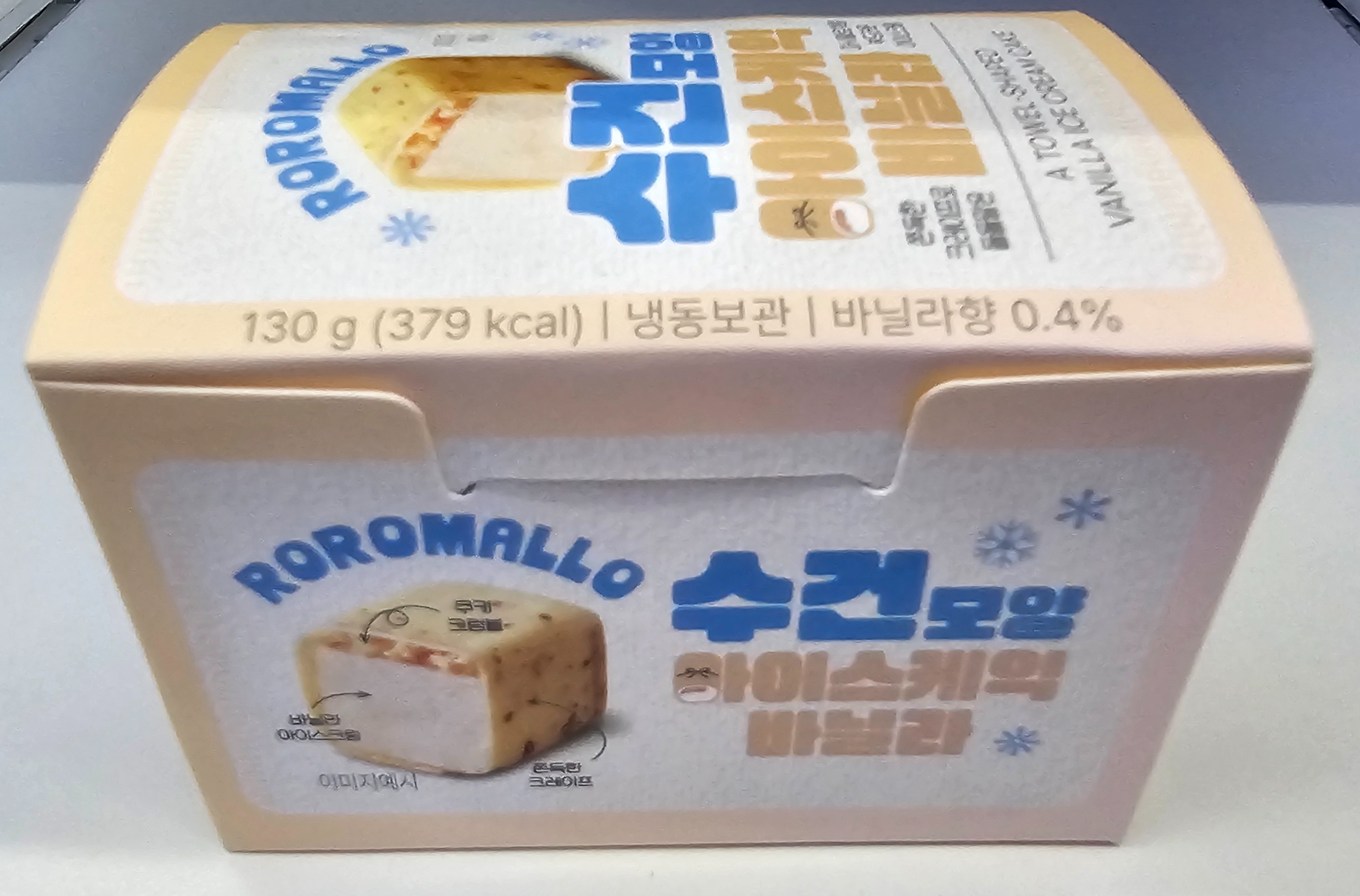 어느새 다 먹어버리고 뭔가 부족하여 아이스크림 쪽을 어슬렁거리는데, 또 크레이프가 있었습니다. 바로 '로로멜로 수건 모양 아이스케익 바닐라(379kcal)'가 그 주인공인데요.