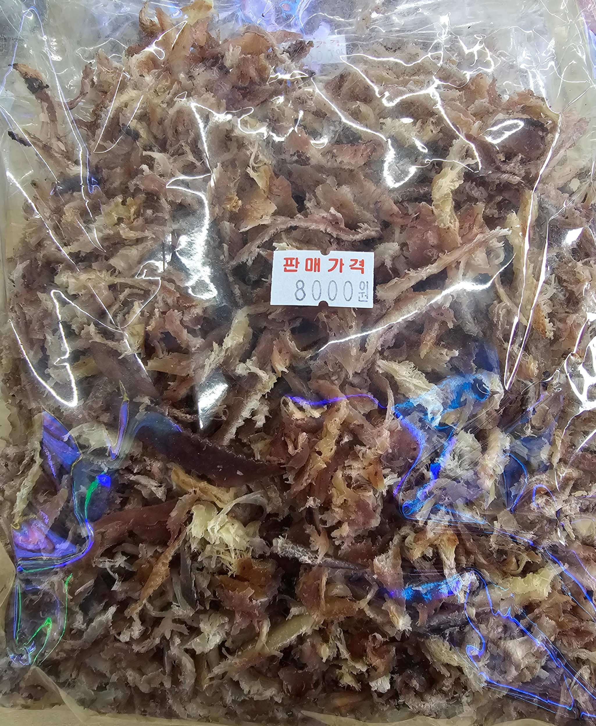 대신 자투리 오징어가 있었는데, 이건 건어물 공장에서 납품받아 파는 거라 값이 8천 원이었어요. 아쉬운 대로 두 봉지 사봅니다ㅎㅎ 입이 심심할 때 오징어만 한 친구가 없죠.