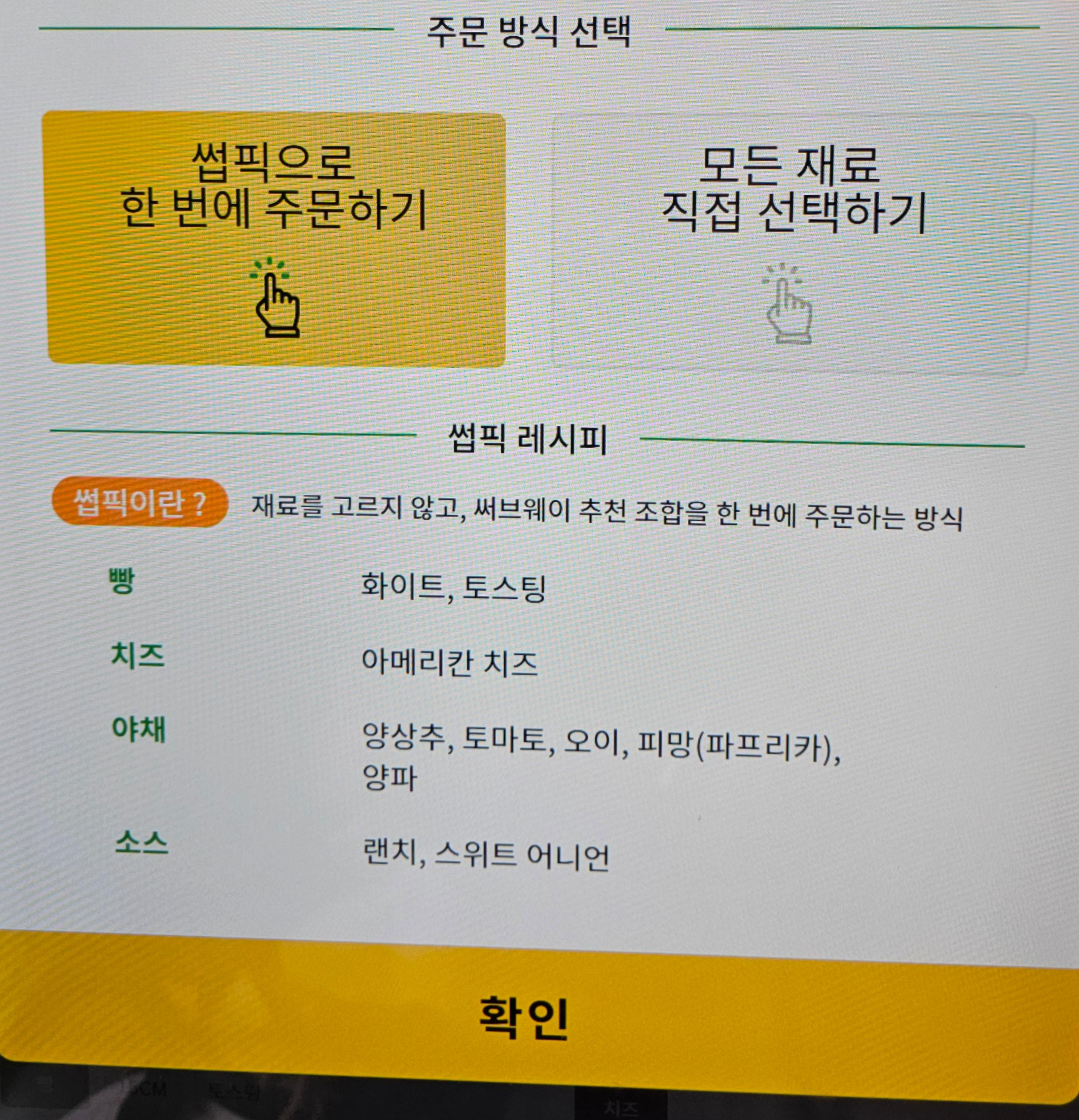 썹픽은 안에 들어갈 야채나 소스들을 알아서 골라주는 주문 방식인데요, 서브웨이에서 픽해준다를 줄여서 썹픽이라고 하지 않았을까 싶어요.