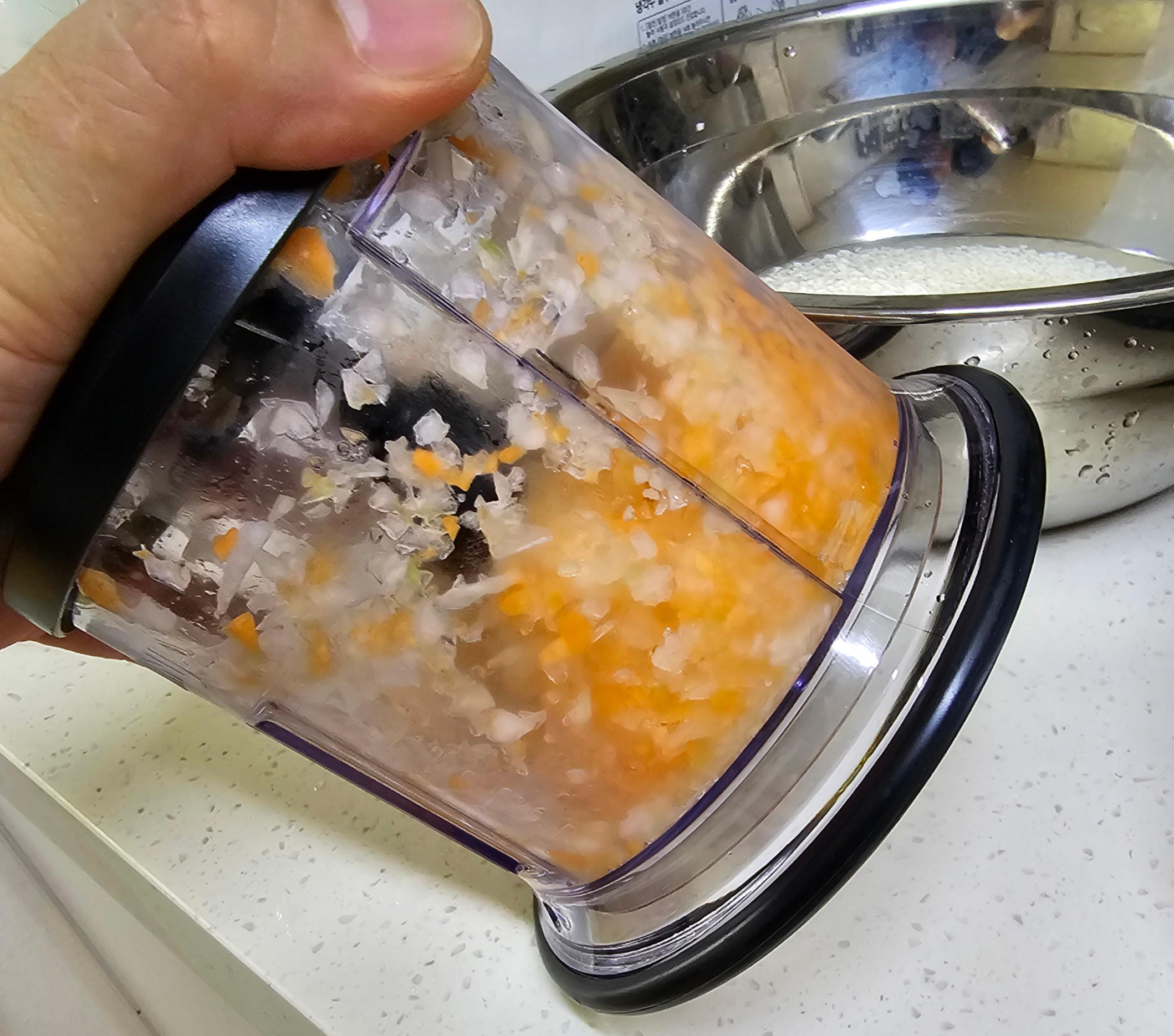 전복죽은 레시피가 간단한데요. 전복은 미리 손질해서 다져놓고 내장도 갈아놨기 때문에 오늘은 아쉽지만 야채를 다져보기로 합니다. 당근이랑 양파를 큼직하게 썰어 넣고 몇 번 돌려보았는데요,
