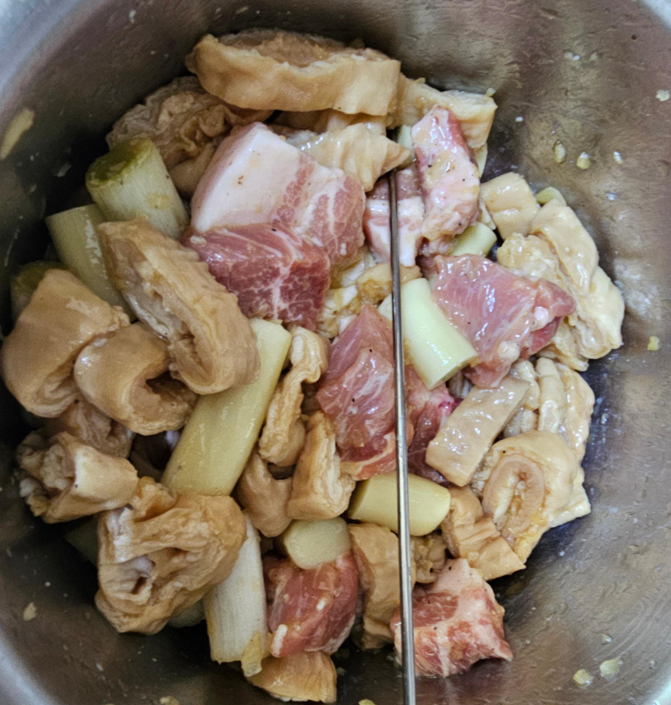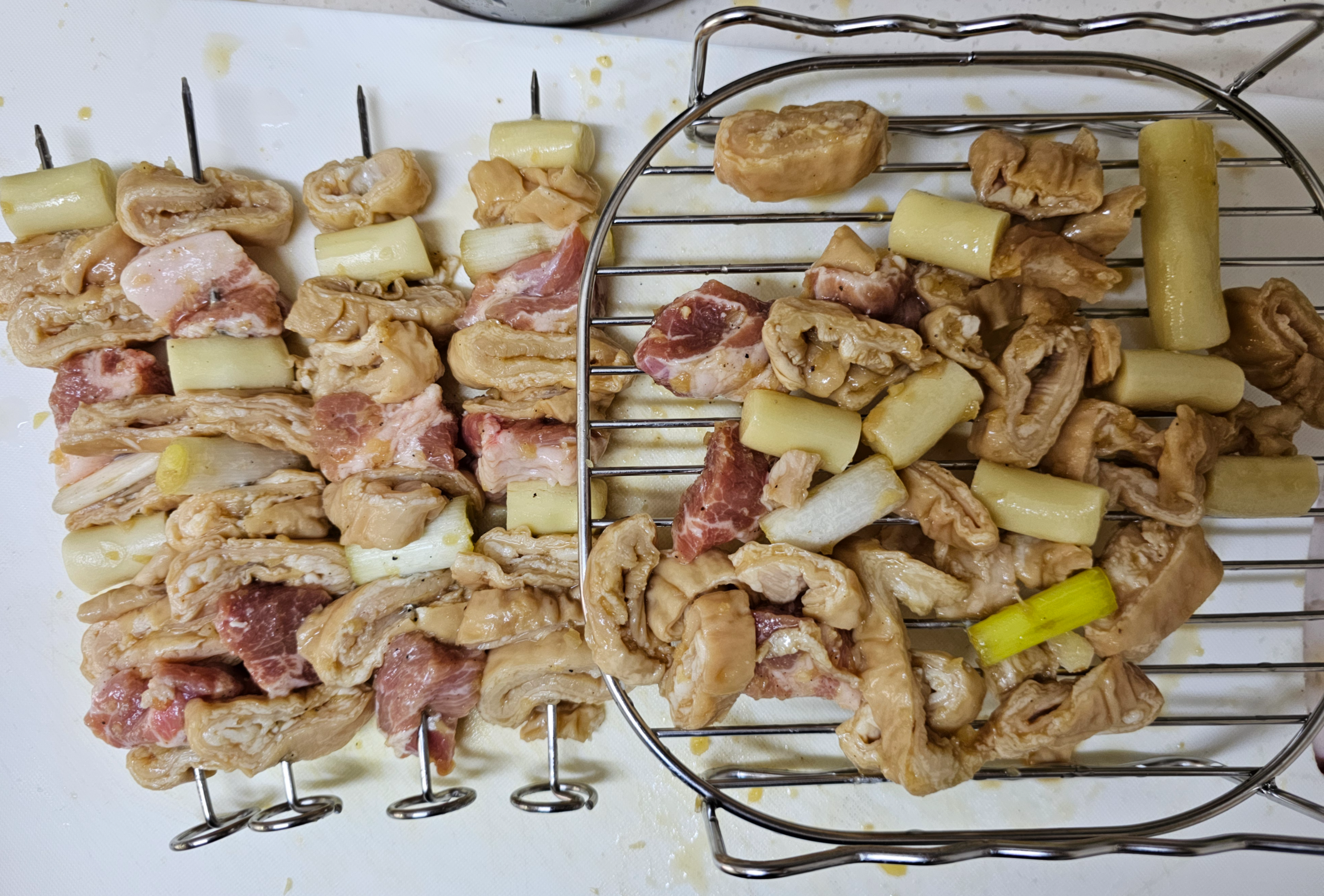 새로 샀으니 당장 테스트를 해봐야겠죠? 제가 좋아하는 돼지 곱창으로 꼬치구이를 해보기로 했습니다. 마트표 돼지 곱창과 집에 있던 목삼겹살을 상온에서 녹인 후, 간장·소주·후추·다진 마늘로 조물조물 1시간 숙성해 밑간을 해줍니다. 간장이 살짝 들어가서 굽기만 해도 맛이 있어요.