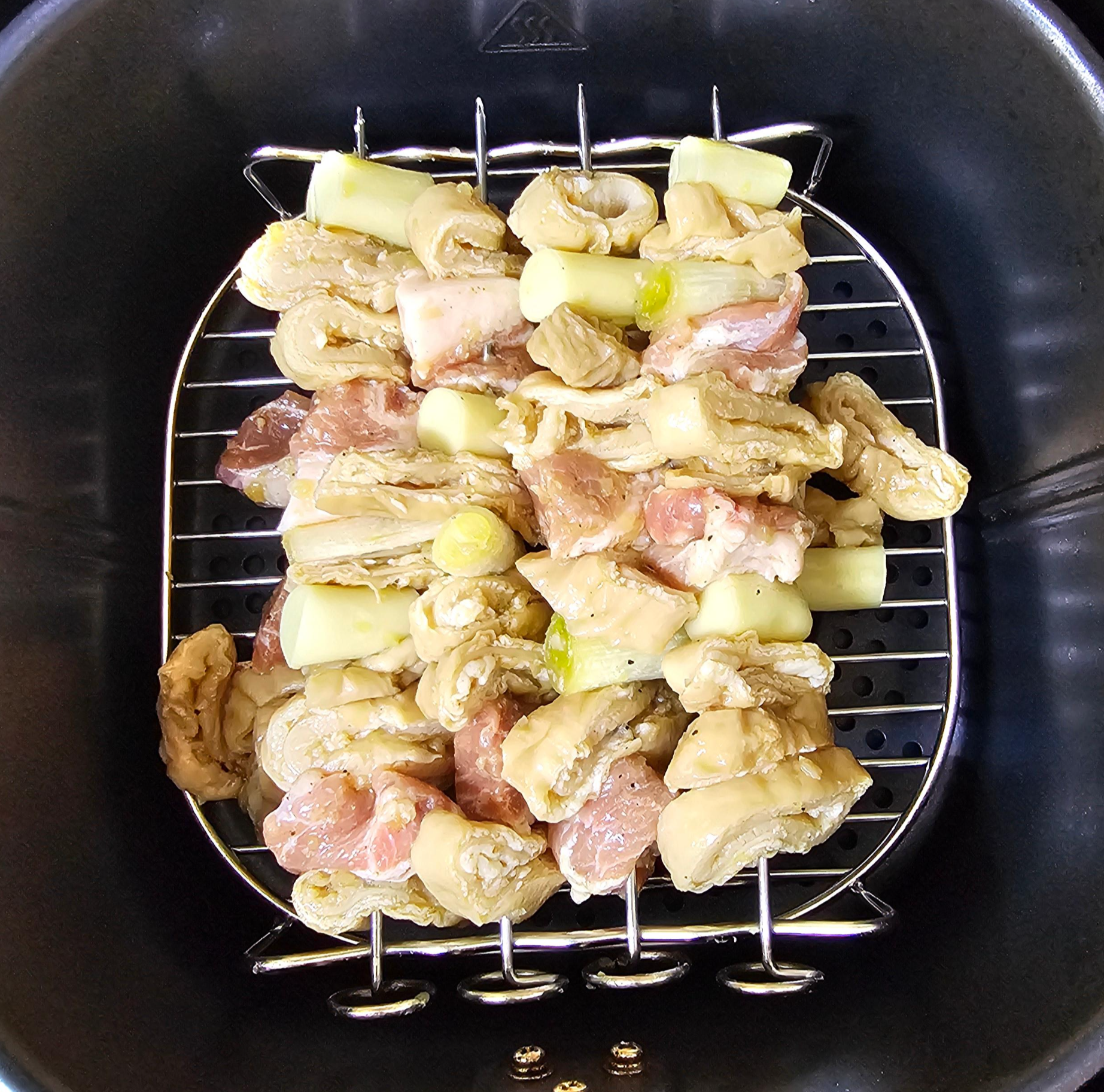 4개의 꼬치에 골고루 꽂아주고, 대파와 떡볶이 떡도 꽂아봤습니다ㅎㅎ 남은 곱창은 꼬치 아래 판에 넓게 펴고 꼬치를 위에 올려 에어프라이어에 넣습니다.