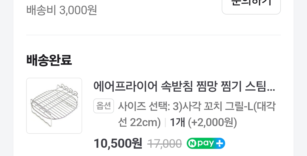 그래서 안쪽에 넣을 수 있는 그릴이나 꼬치를 찾다가 발견한 제품이 바로 이 녀석! 세 가지 사이즈가 있는데, 저희 집 에어프라이어에는 제일 큰 사이즈가 딱 맞아서 큰 걸로 구매했습니다. 배송비 포함 13,500원! 처음 도착했을 때는 사진보다 작아 보였지만, 에어프라이어에 넣어보니 완벽하게 맞아 너무 좋았어요. 스테인리스 제품이라 연마제 제거부터 했는데, 생각보다 거의 나오지 않아 안심하고 바로 사용 가능했습니다.