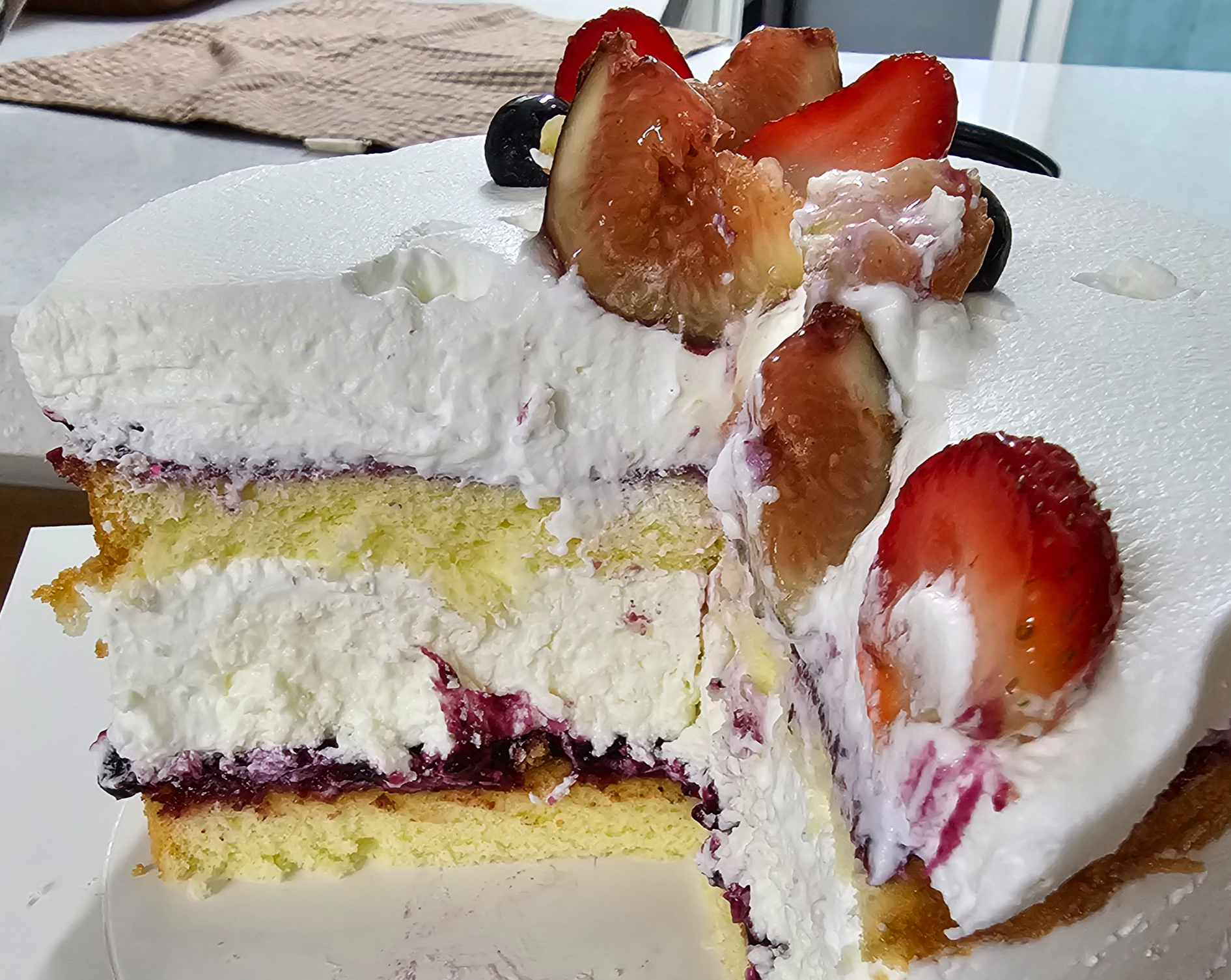 안쪽에 보이시나요? 빵은 별로 없어요ㅎㅎ 크림이 훨씬 많아 부드러울 수밖에 없어 보이죠? 케이크 위쪽에는 딸기와 무화과가 장식되어 있는데, 무화과가 달지 않은 과일임에도 불구하고 생크림이 워낙 달지 않고 깔끔해서 잘 어울립니다.