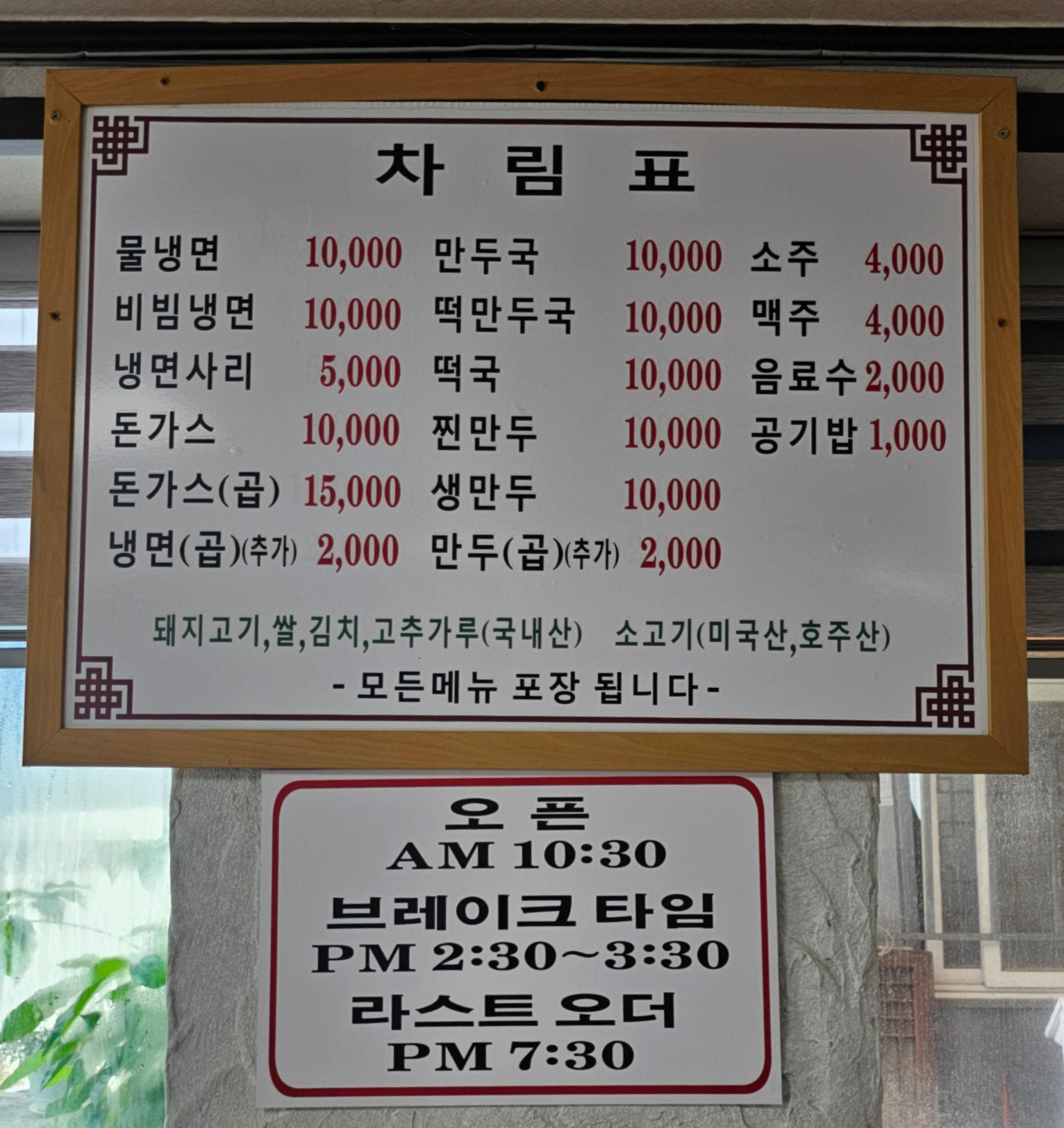 드디어 도착했습니다. 간판이 어딘가 옛스러운 느낌으로 오랫동안 운영해 온 가게라는 것을 바로 알 수 있었습니다. 입구는 그리 넓어 보이지는 않았지만 안쪽으로 깊은 구조의 매장이라서 식사할 수 있는 테이블이 꽤 많더군요. 메뉴판에는 냉면, 돈가스, 만두 딱 이 세 가지로 다 할 수 있는 메뉴들로 구성되어 있습니다.