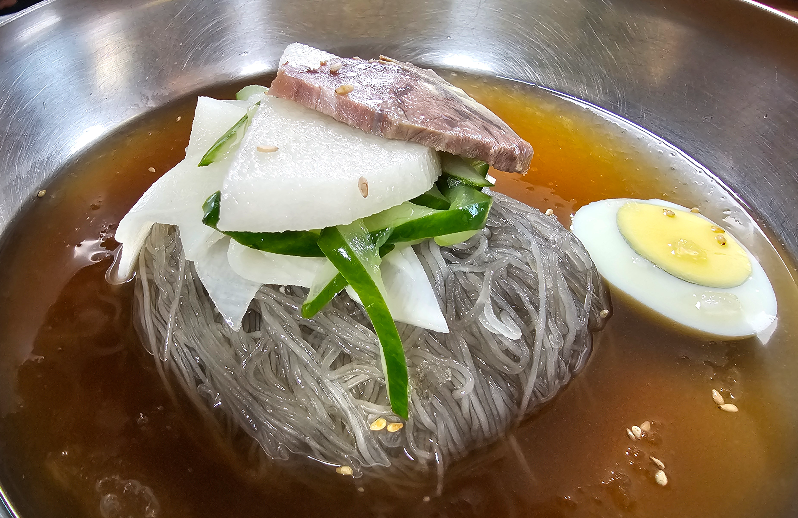 더 신기한 건 오이입니다. 냉면 국물의 맛을 올려주고 아삭함을 책임져주는 오이가 그냥 오이가 아니라 오이지였습니다..(충격) 냉면 안에 오이지는 처음이라 많이 당황하였지만 익숙한 맛 들인데 양념 자체가 서로 친한 애들이라 거슬림이 없어 맛있더군요. 국물은 제 혀가 기억하는 바로 그 옛날식 냉면 육수 맛. 올라간 고기도 사태 부위 같은데 퍽퍽하지 않고 담백했습니다.