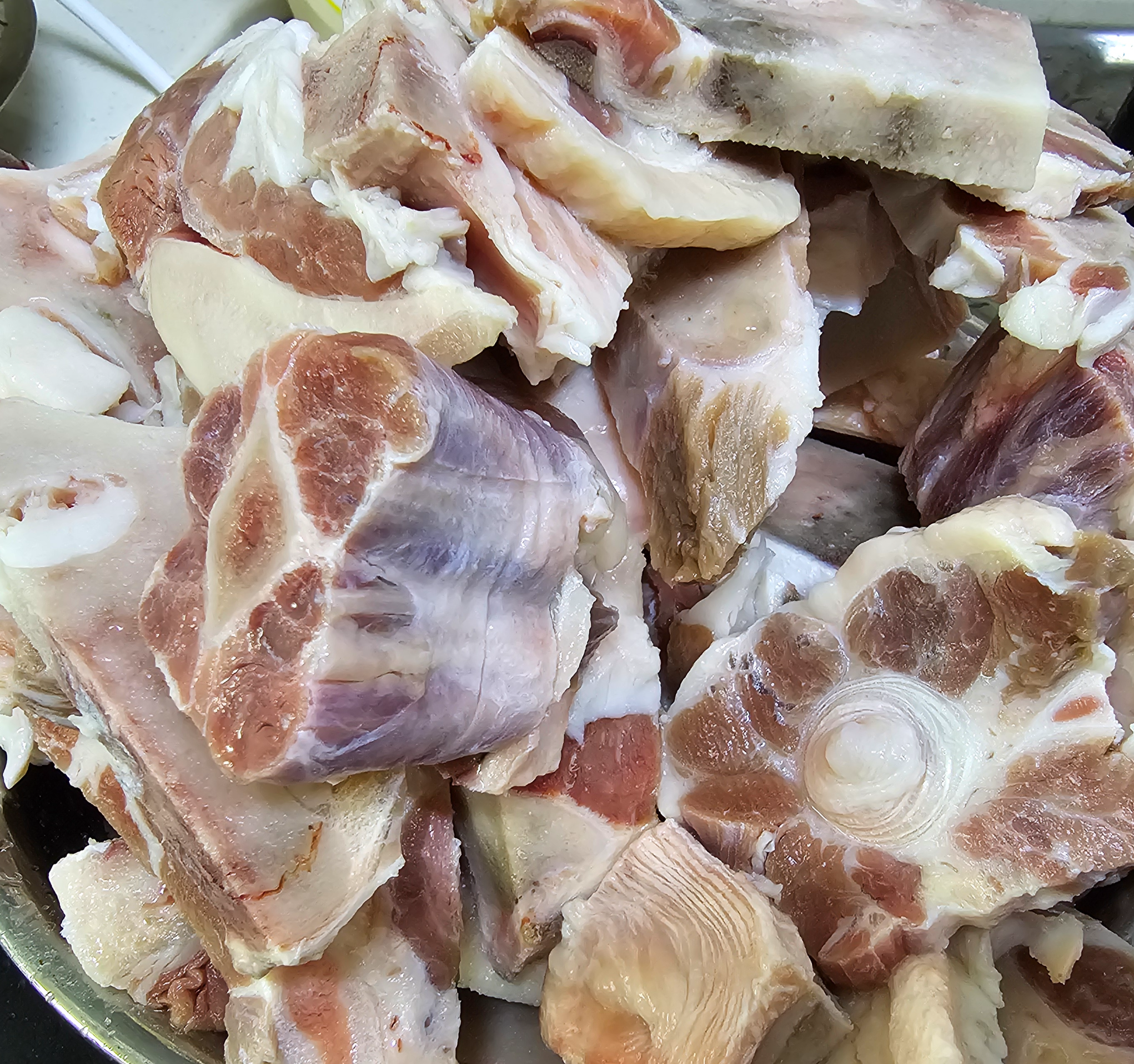 우선 냉동 상태의 소꼬리를 큰 양푼이에 넣고 해동하면서 핏물을 제거해 주었어요.