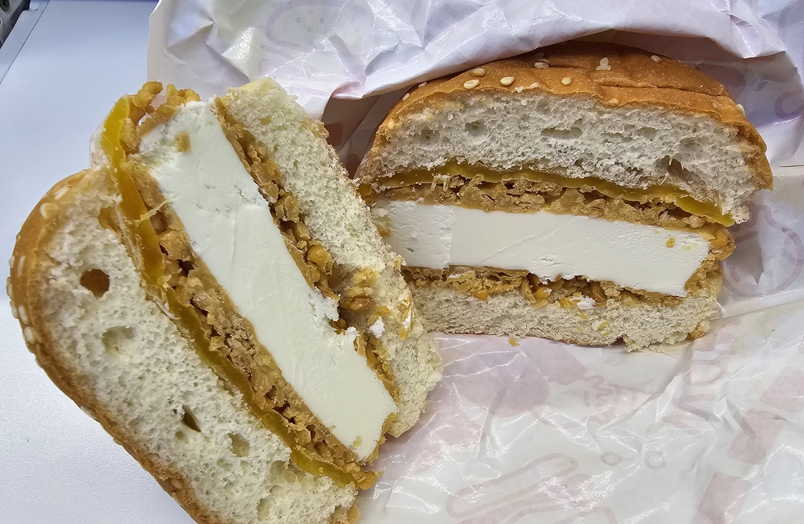 속이 궁금해 반을 갈라보니, 햄버거 빵 사이에 바닐라 아이스크림이 올려져 있고, 치즈 모양의 떡이 얹어져 있었습니다. 바닐라 아이스크림은 마치 튀김옷을 입은 듯 쿠키 크럼블로 코팅돼 있어 햄버거 패티처럼 보이더군요. 시각적인 완성도가 상당했습니다.
