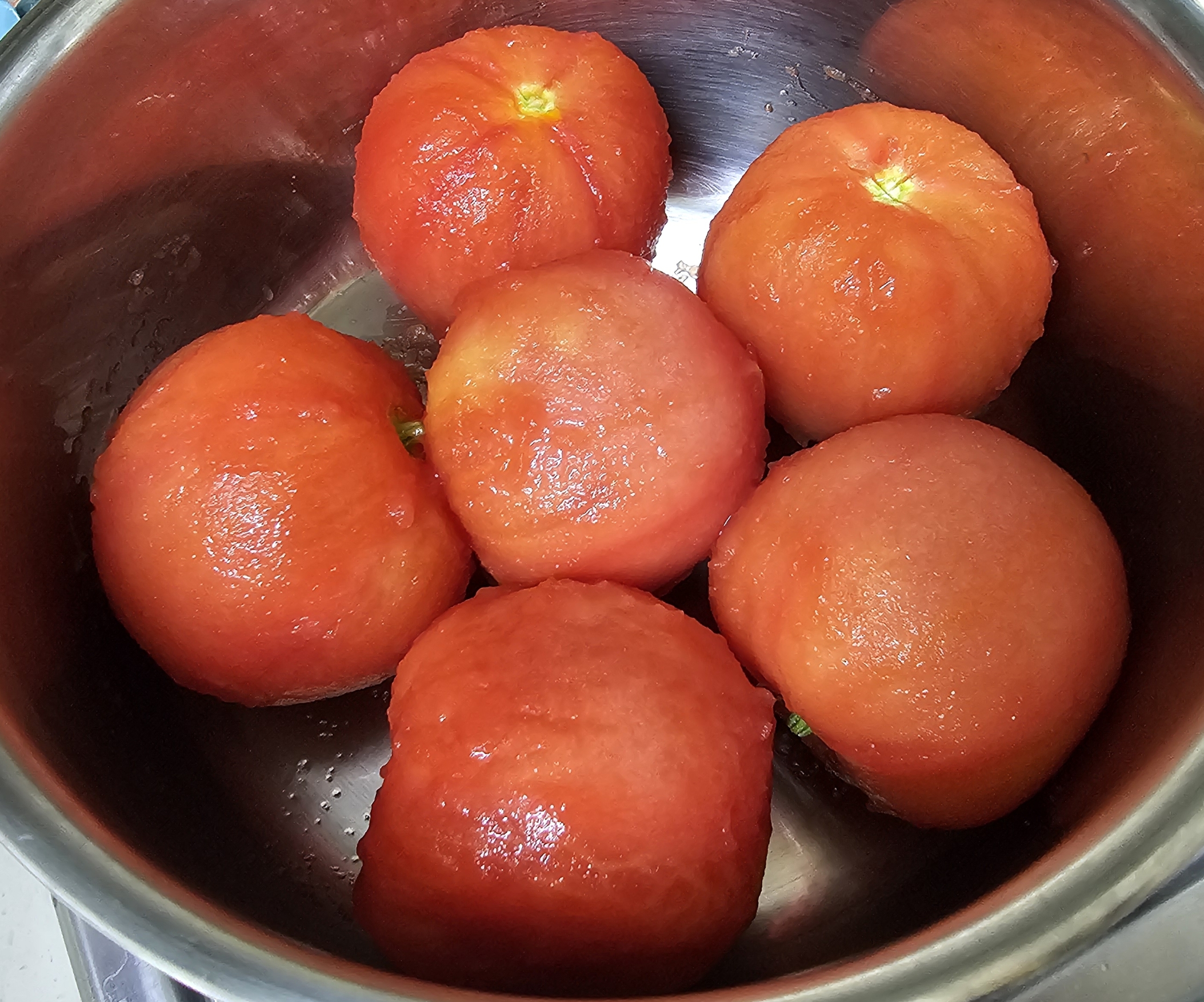 말려나간 껍질을 전부 벗기고 나면 토마토 알맹이만 남습니다.