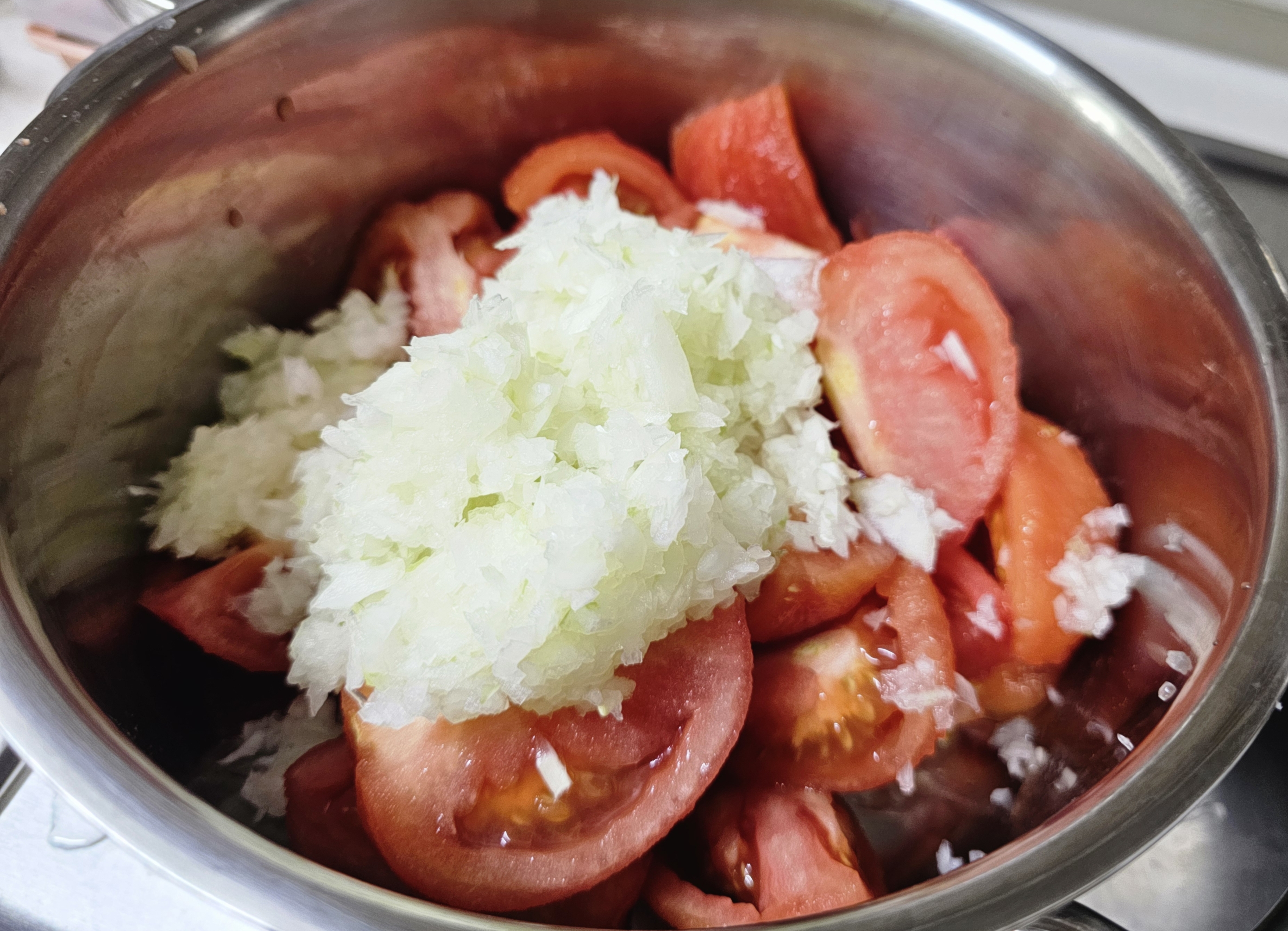 이제 본격적으로 소스를 만들 차례입니다. 넓은 냄비에 손질한 토마토를 넣고, 올리브오일 3숟가락과 다진 마늘 1숟가락, 그리고 다진 양파를 함께 넣어줍니다.