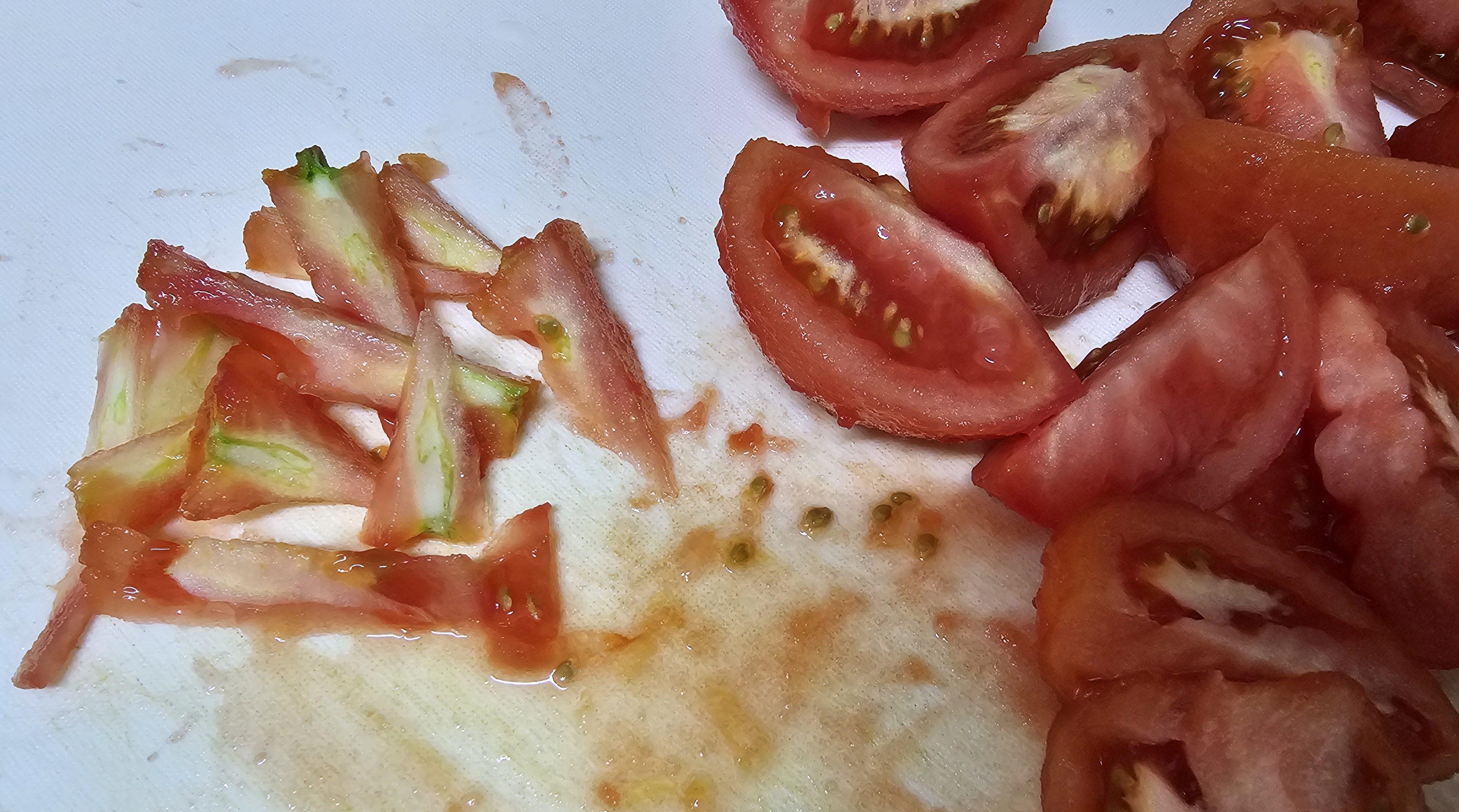 여기서 한 가지 더 손질해야 할 부분이 있는데, 바로 토마토 중앙의 심입니다. 심은 조리 해도 쉽게 무르지 않고 식감도 좋지 않기 때문에 제거하는 것이 좋습니다.