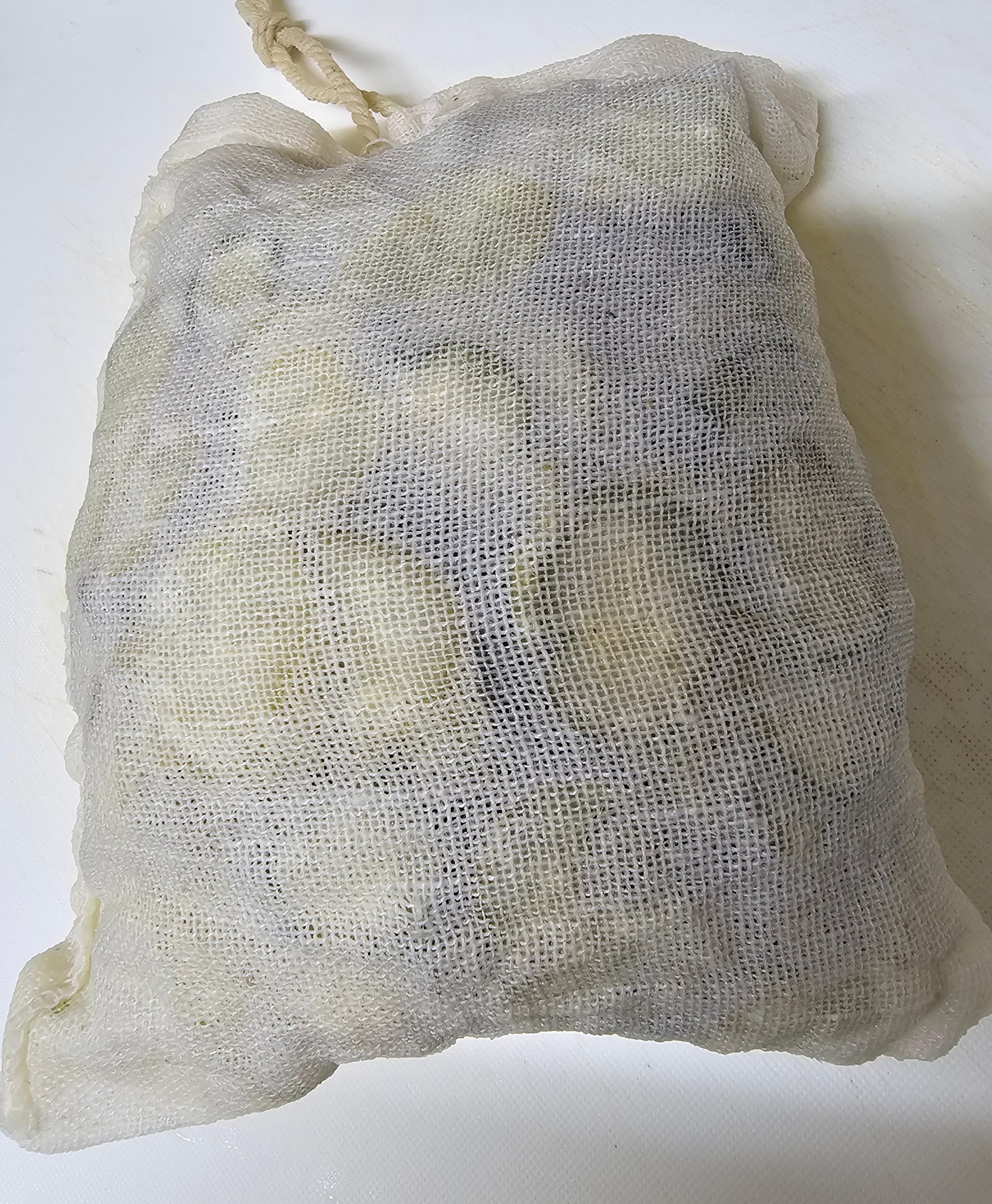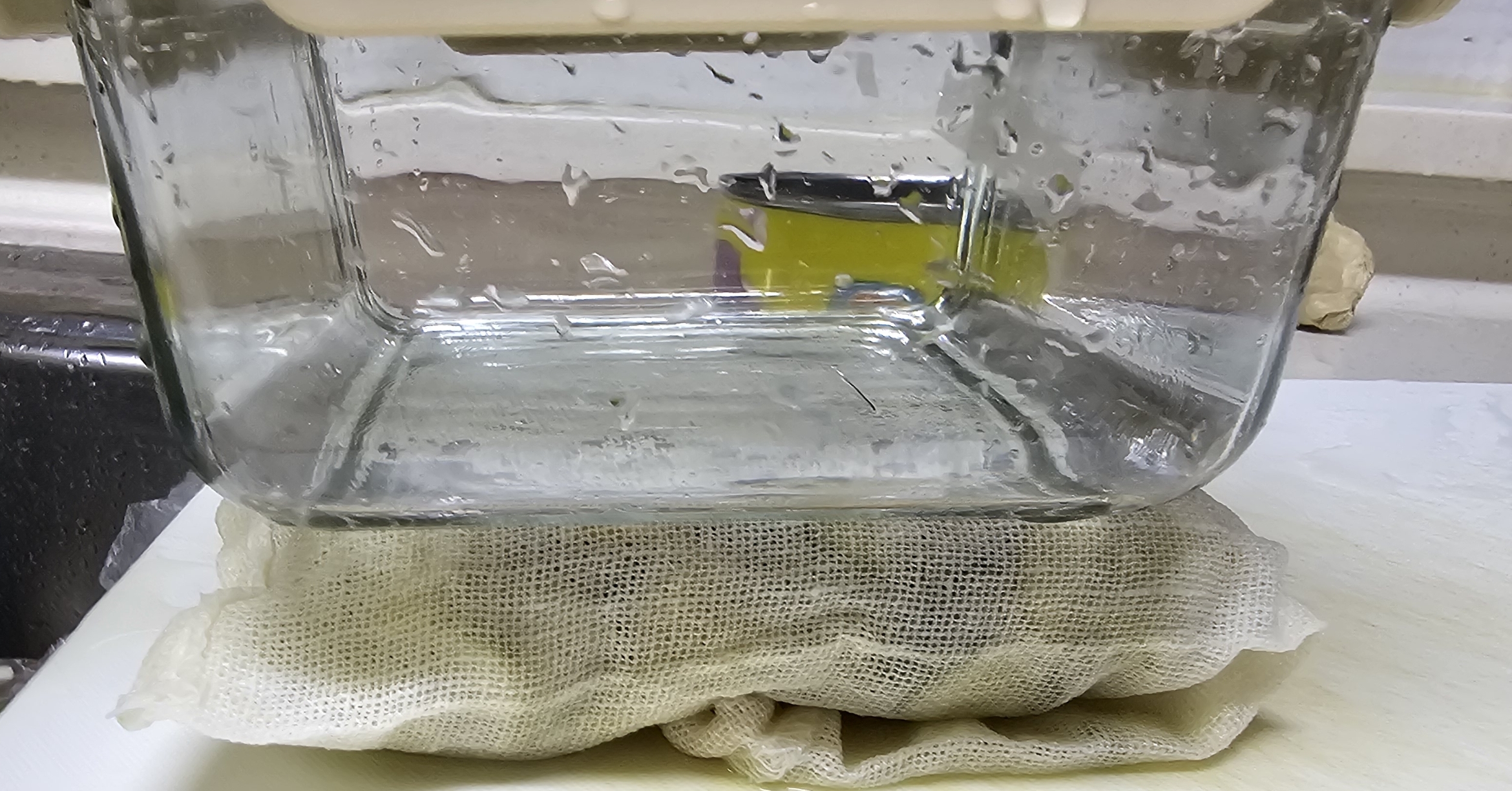 삼베 주머니에 넣어 걸어두거나, 천보에 싸서 무거운 돌로 눌러두는 방법 등이 있습니다. 저는 삼베 주머니에 싸서 잠시 걸어둔 뒤, 밀폐용기에 물을 담아 눌러 물기를 빼주었습니다.