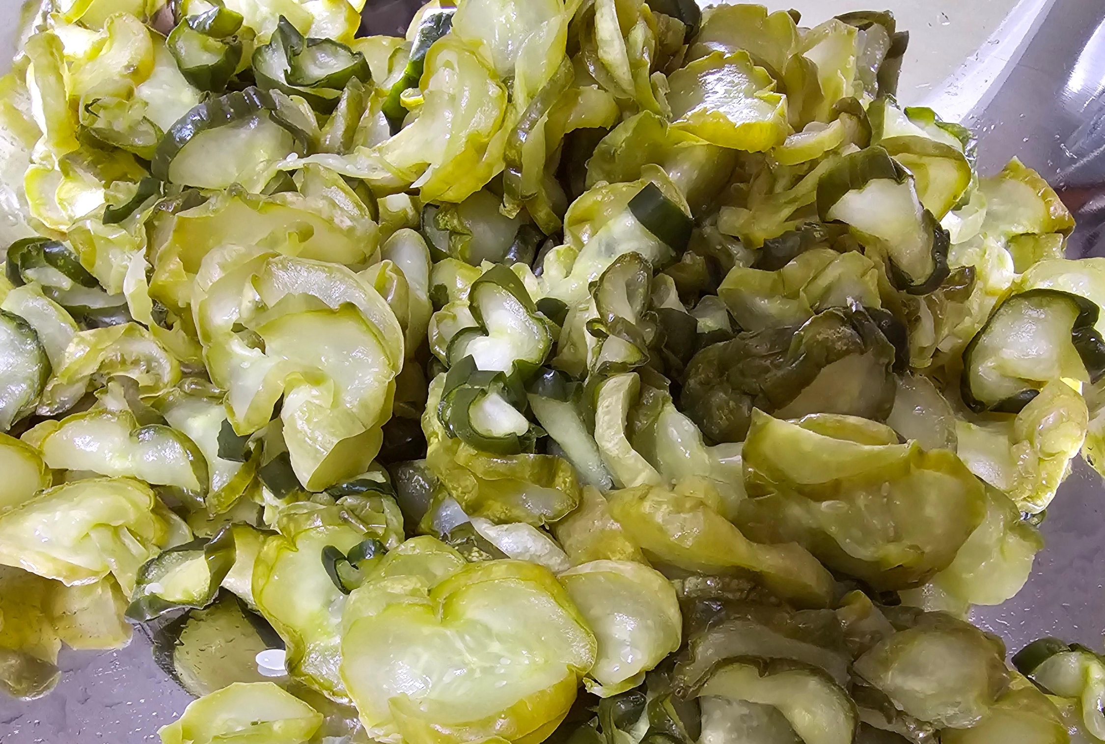 썰어놓은 오이지는 절인 지 한 달 정도 되어 짠맛이 강하기 때문에 찬물에 약 5분간 담가 짠기를 빼주었습니다.