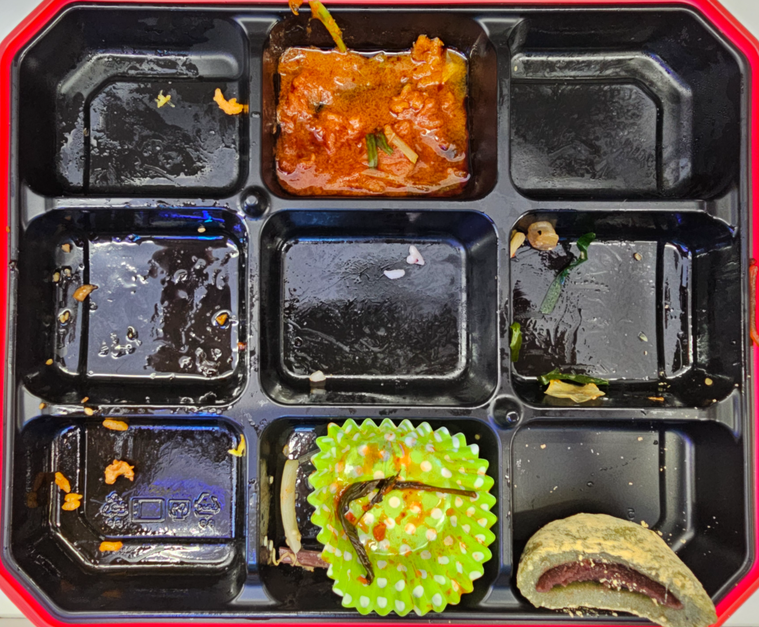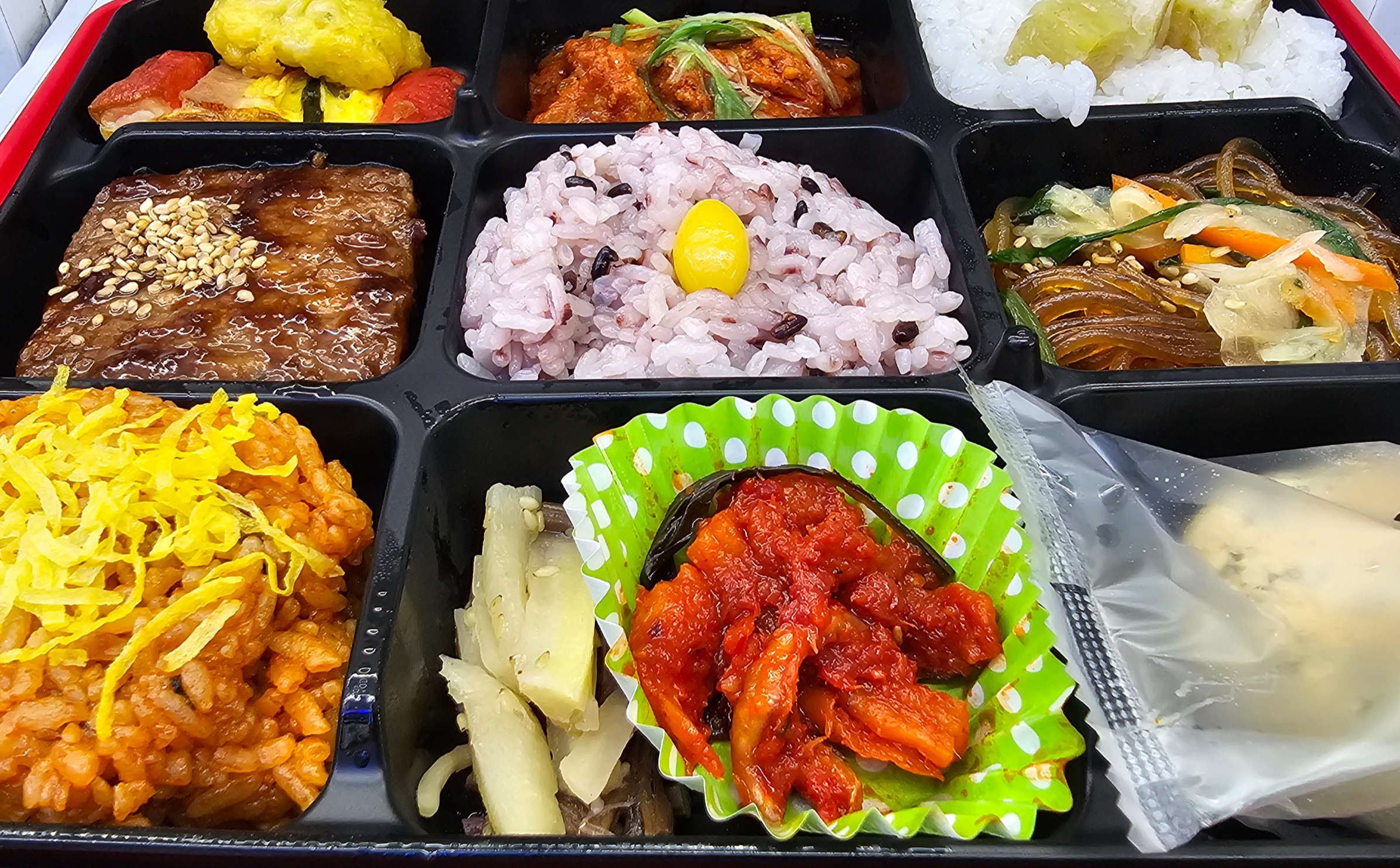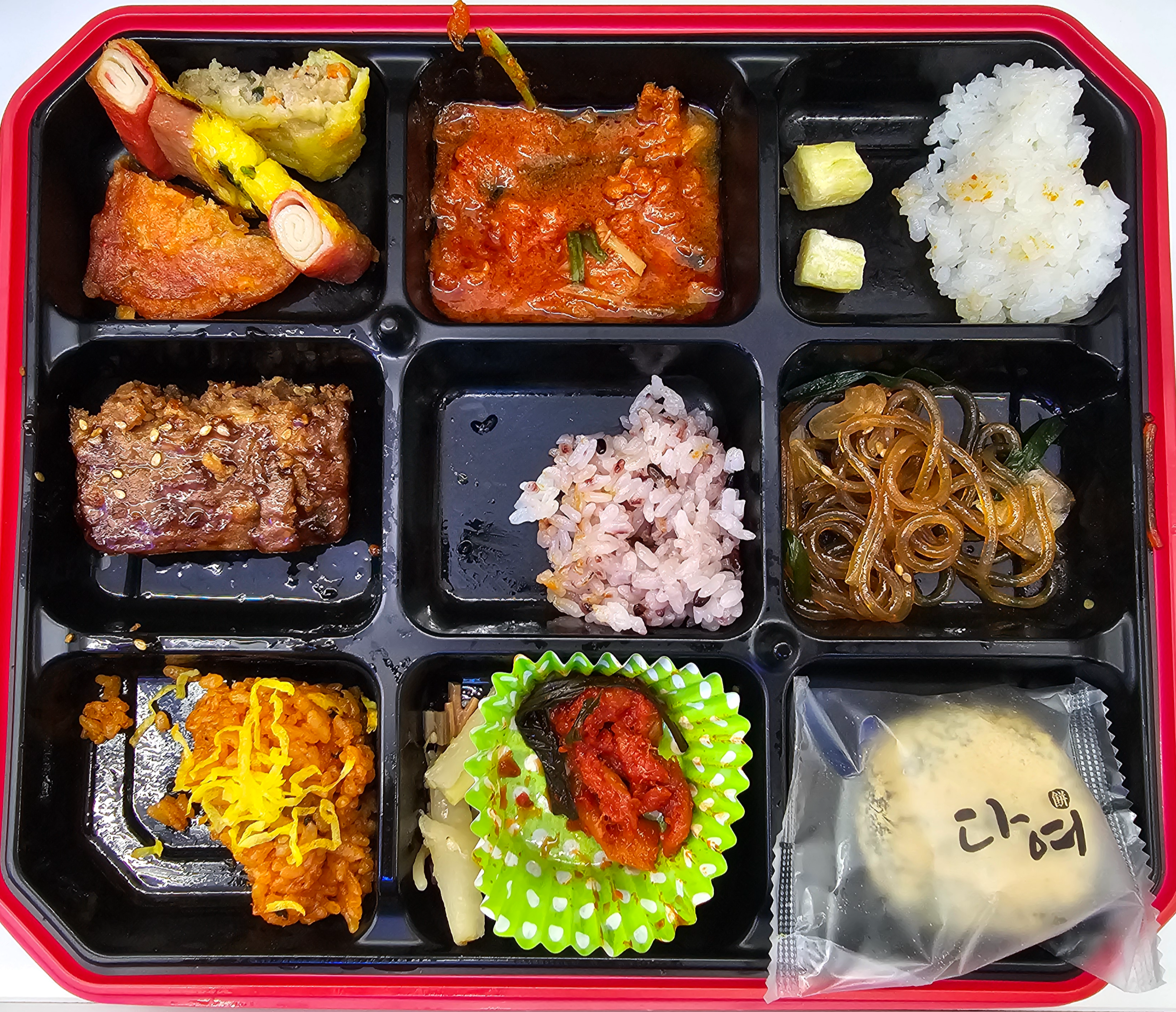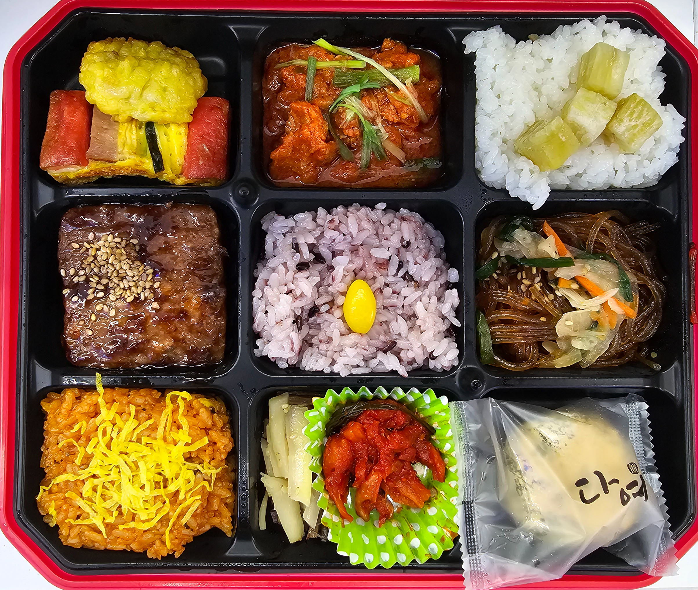 구성은 꽤 다양했습니다. 밥은 흑미밥(은행 토핑), 김치볶음밥, 고구마밥 세 종류로 준비되어 있었고, 반찬은 고추장양념 제육, 너비아니구이, 꼬치산적, 동그랑땡, 김치전이 메인. 그 외에도 잡채와 세 가지 나물(고사리, 도라지, 명태무말랭이무침)까지 포함되어 있었습니다.